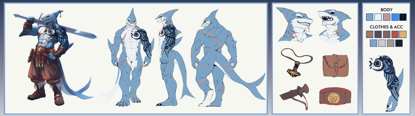1 full body dynamic pose (Rendered) + 2 full body (front/side/back view) + 2 expressions portrait + accessories.